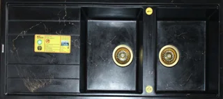 سینک آشپزخانه دو لگنه گرانیتی فانتزی مشکی هرما مدل S1003 همراه با پک سیفون فانتزی و تخته گوشت اشانتیون